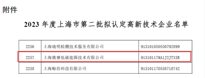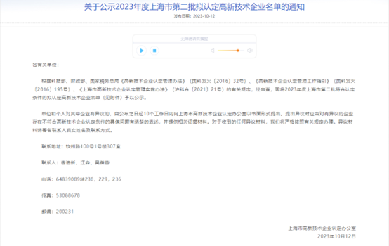 根据科技部、财政部、国家税务总局《高新技术企业认定管理办法》(国科发火〔2016〕32号)、《高新技术企业认定管理工作指引》(国科发火〔2016〕195号)、《上海市高新技术企业认定管理实施办法》(沪科合〔2021〕21号)的有关规定,上海市高新技术企业认定办公室于2023年10月12日,公布2023年度上海市第二批符合认定条件的拟认定高新技术企业名单(见附件),我司顺利通过了高新技术企业认定。