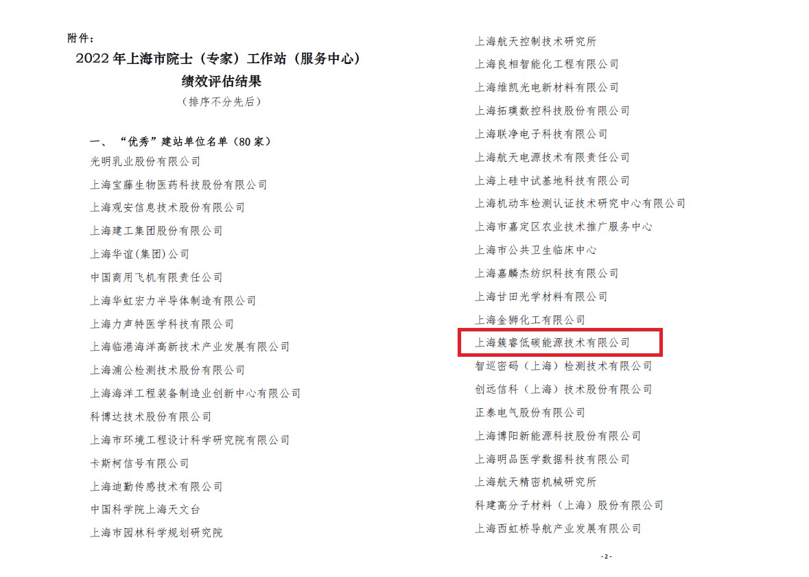 近日,上海市院士专家工作站指导办公室公布了2022年上海市院士(专家)工作站(服务中心)绩效评估结果,上海簇睿低碳能源技术有限公司被评为“2022年上海市优秀院士工作站”。