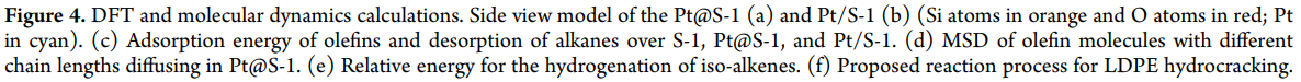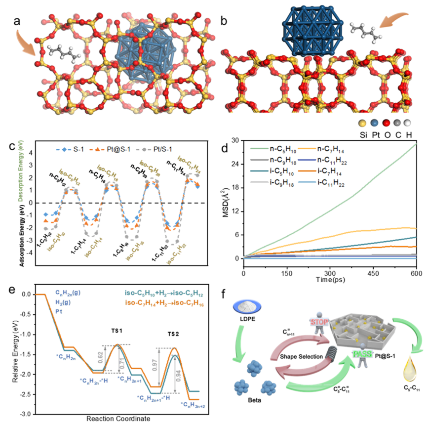 为了进一步揭示分子筛择形过程与反应机理,低碳平台参与理论计算合作,进行了DFT与分子动力学的计算。结果显示,对于C5至C11烯烃,吸附能量逐渐降低,长链分子上的多位点增强了吸附稳定性,合适强度的吸附能有利于烯烃的吸附以及烷烃的脱附。对不同烯烃在Pt@S-1的扩散速率进行了模拟计算,发现短链烯烃可以在沸石孔隙中更快地扩散,而侧链结构增加了扩散阻力并阻碍了流动性。短链烯烃的快速扩散有利于它们与铂纳米颗粒的接触和加氢反应,从而提高了C5-C7烃类的选择性。